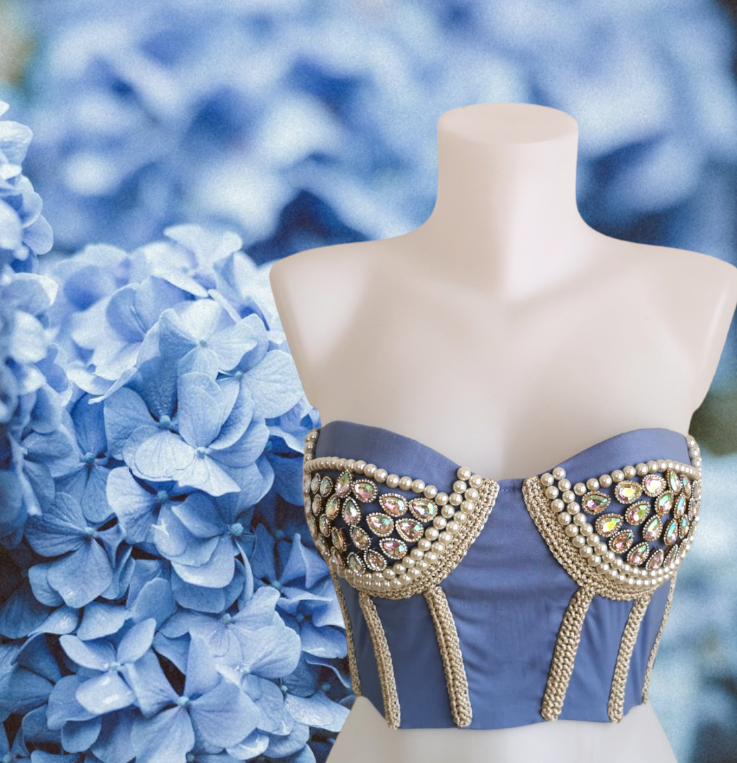 Κορσές με πέρλες και κρύσταλλα. Κορσές διακοσμημένος με ασημί πλεκτό 36% polyester επιμεταλλωμένο με καθαρό ασήμι 64% rayon με πιστοποίηση ΟΕΚΟ-ΤΕΧ σε γαλάζιο χρώμα. Συνδυασμένο με 44 κρύσταλλα σε σχήμα δάκρυ και περισσότερες από 150 γυάλινες πέρλες σε λευκό χρώμα.