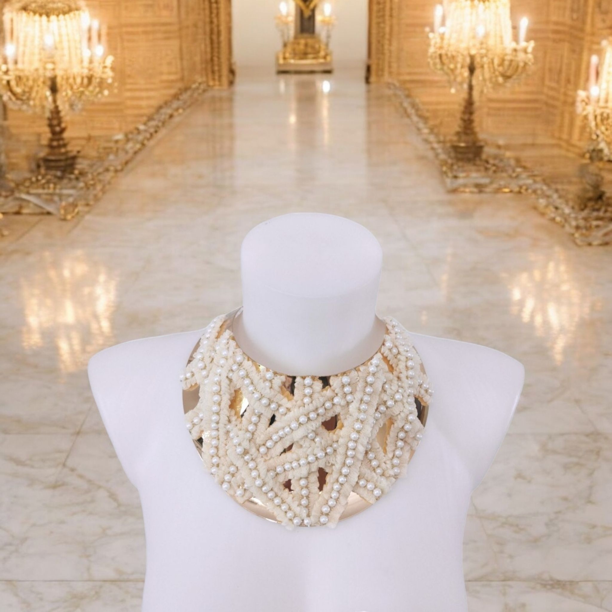 Κολάρο με κορδέλες και πέρλες. Μεταλλικό περιδέραιο σε χρώμα ροζ χρυσό διακοσμημένο με σειρές από κορδέλα τούλι και εκρού πέρλες.